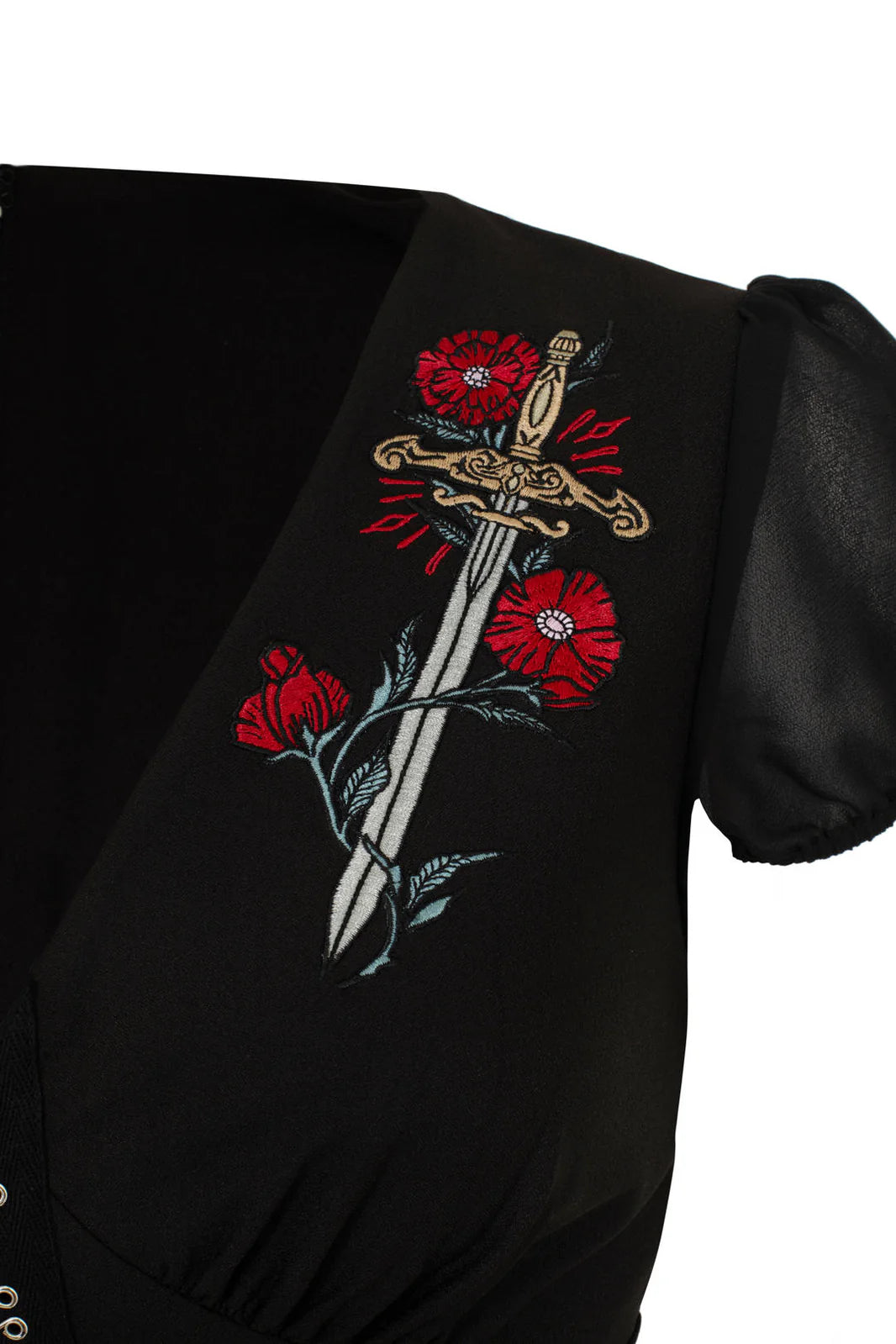 Dark, romantic and a little dangerous. The Elyse Dress is a black mini dress with statement embroidery featuring flowers and a dagger — soft and sharp at the same time.