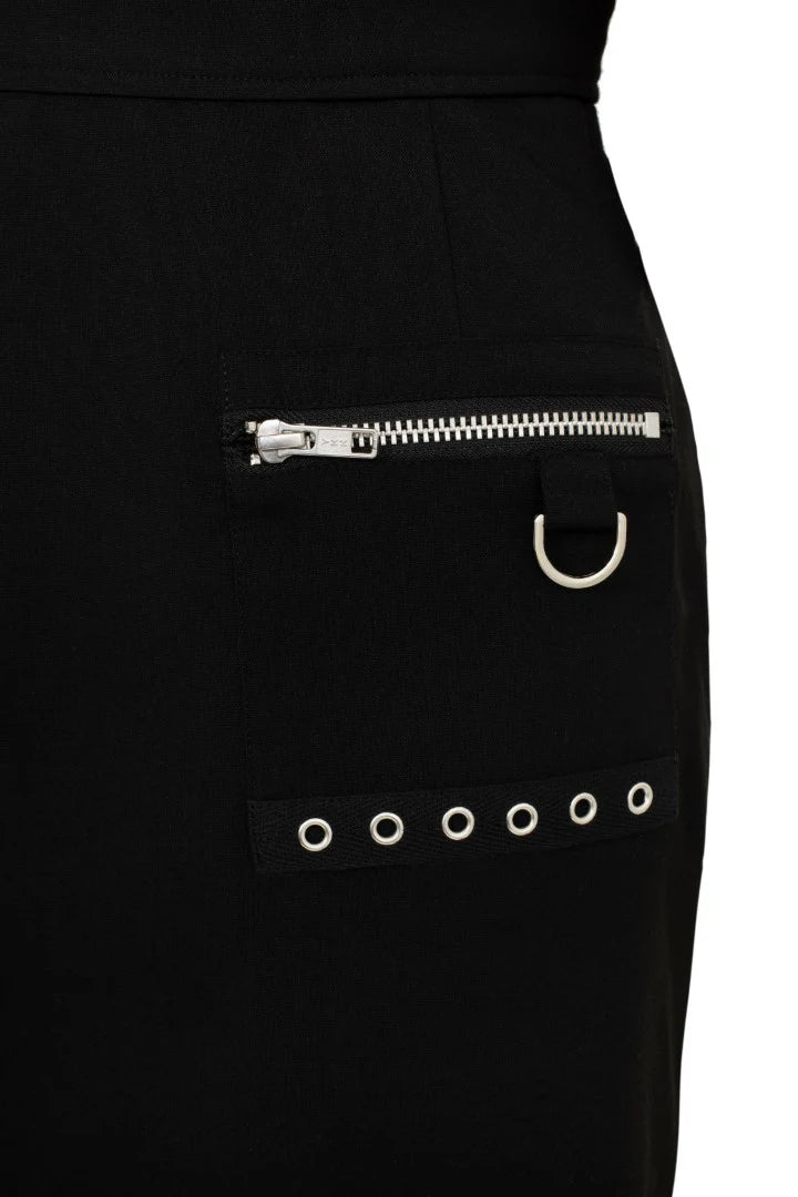 Dark, sharp, and layered in attitude. The Mallory Pinafore Dress is a black mini with a deep V-neckline, mock wrap detail, and silver hardware that brings the edge. The ring belt and zip patch pocket with d-rings and eyelets give it that full metal moment. Wear it solo or layer it up — this one's made to transform.