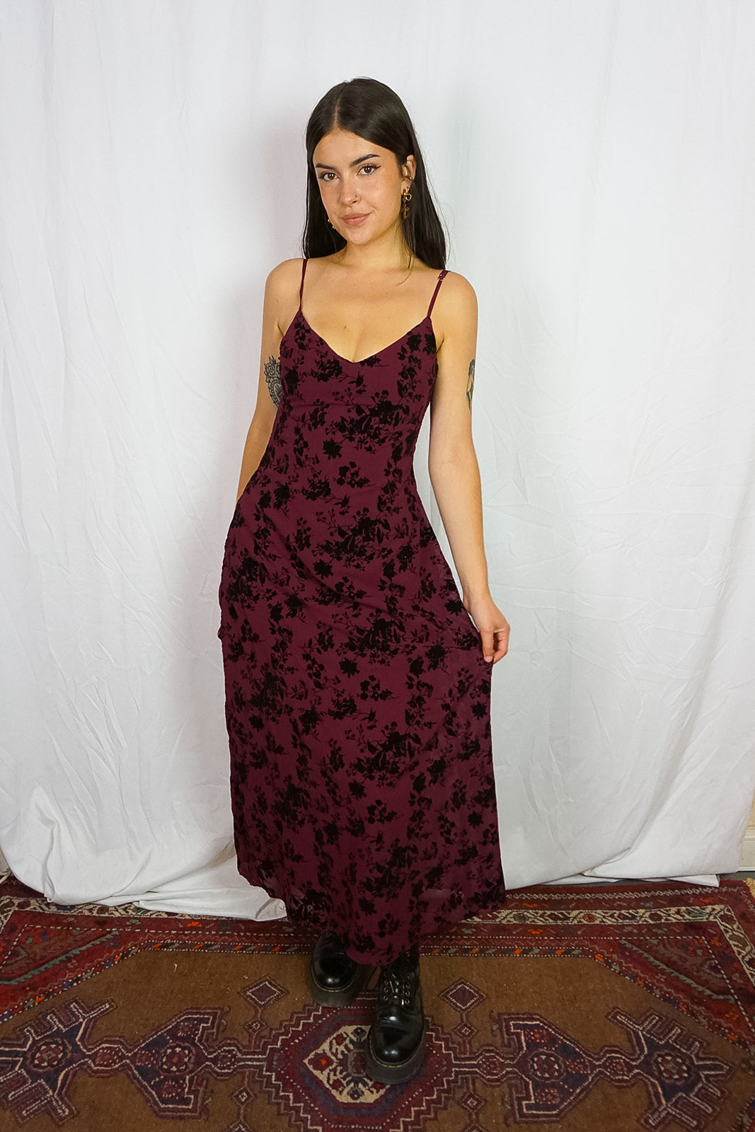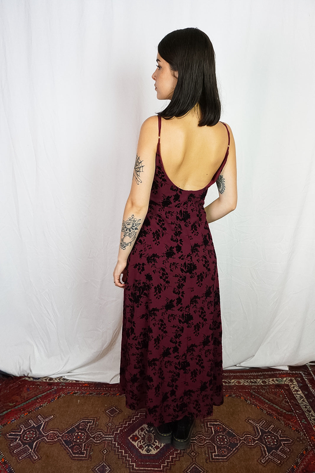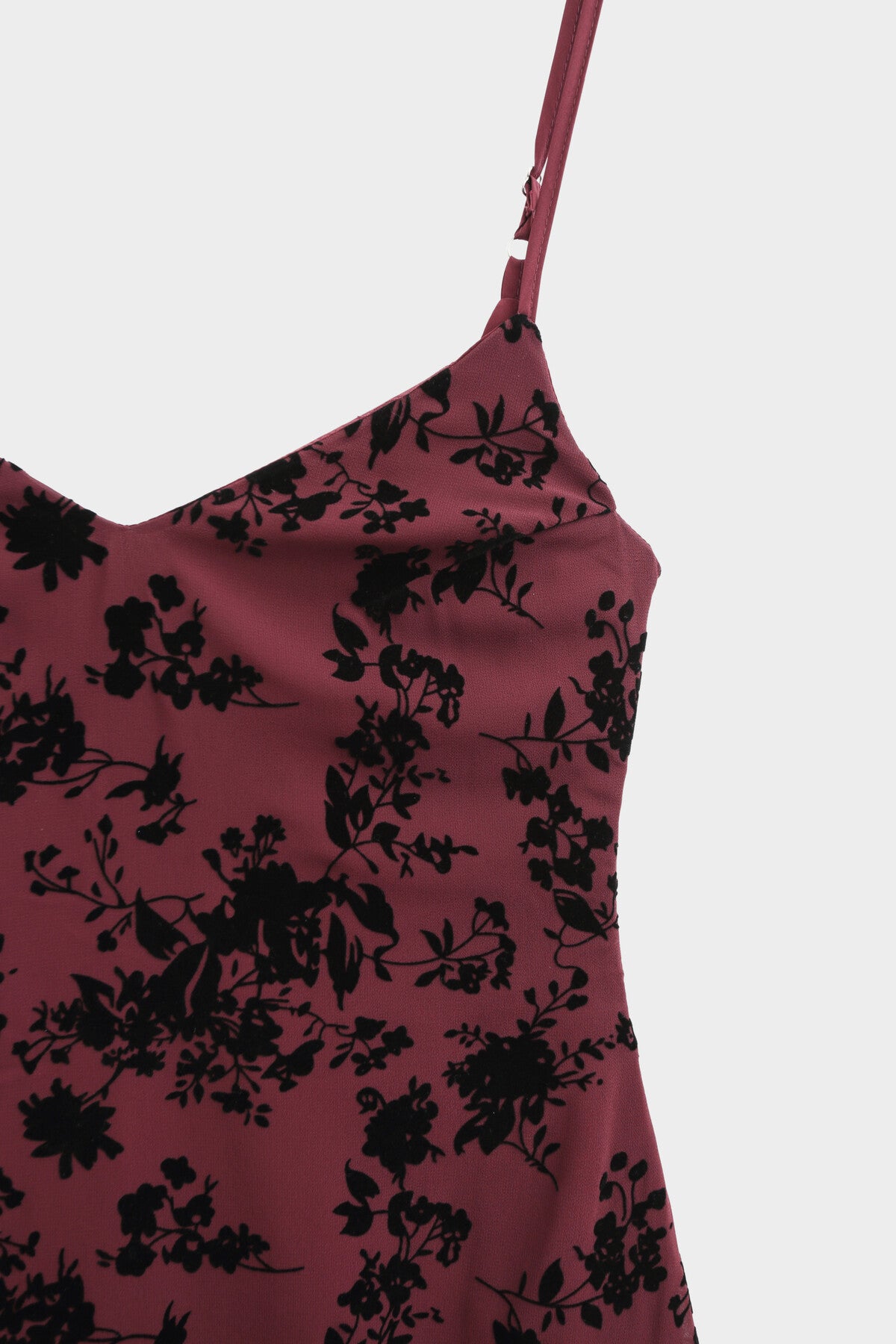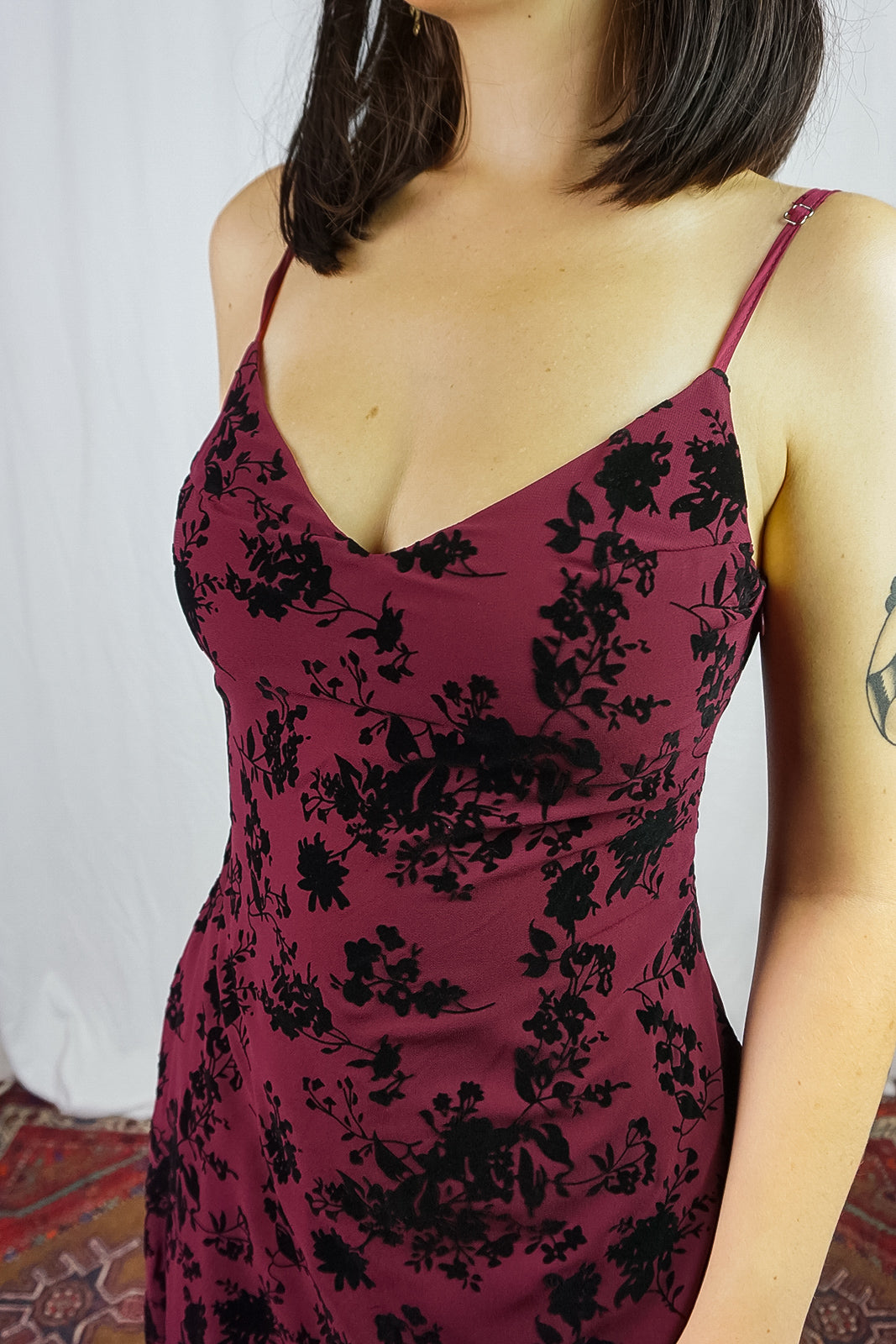 Turn heads with the Nocturna Slip Dress in the beautiful red wine color. The rich wine-red base combined with a black floral overlay gives this piece a sultry, gothic romance vibe. Featuring thin straps and a low back, it’s both daring and elegant, whether you’re out at a summer festival or dressing up for an evening event.