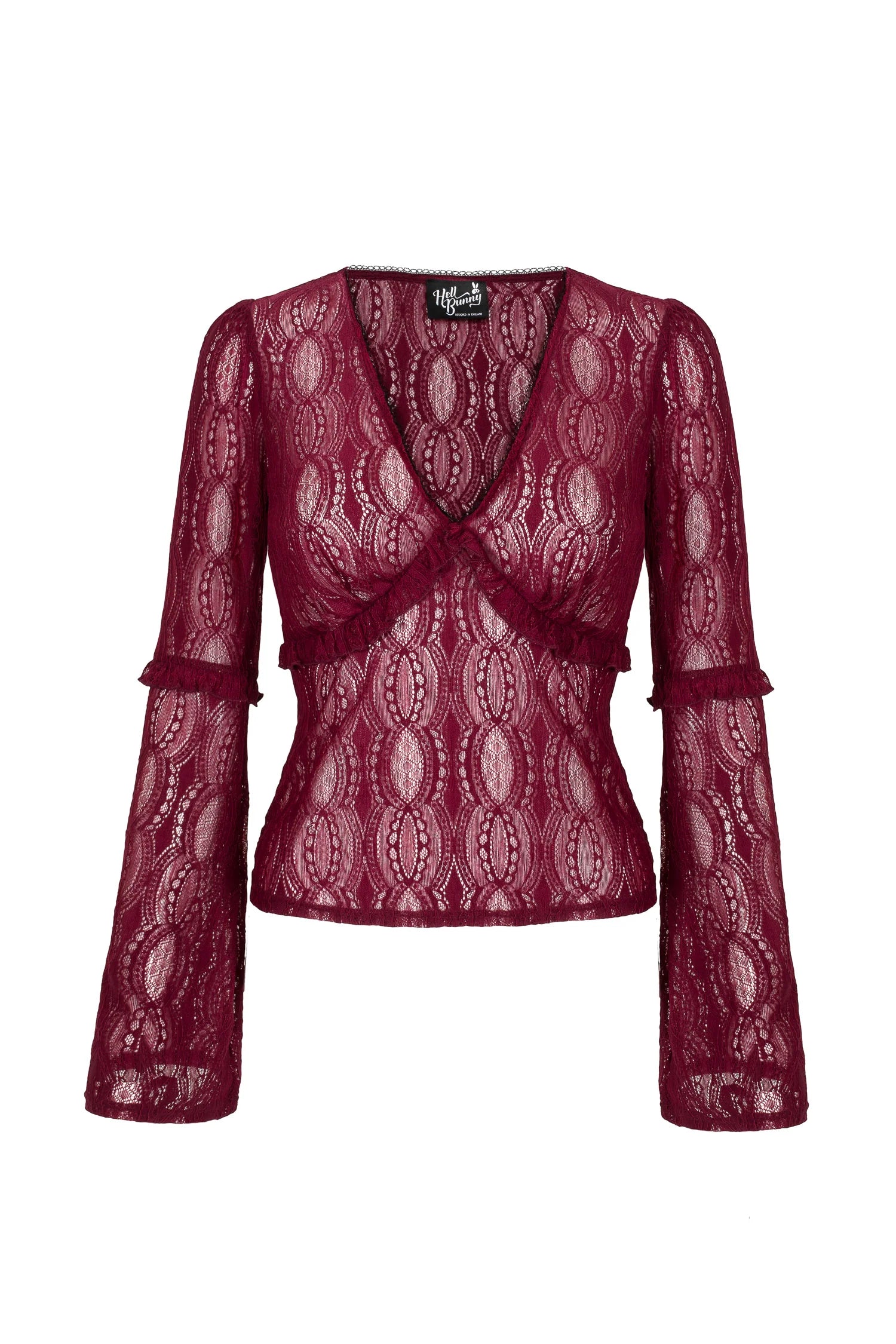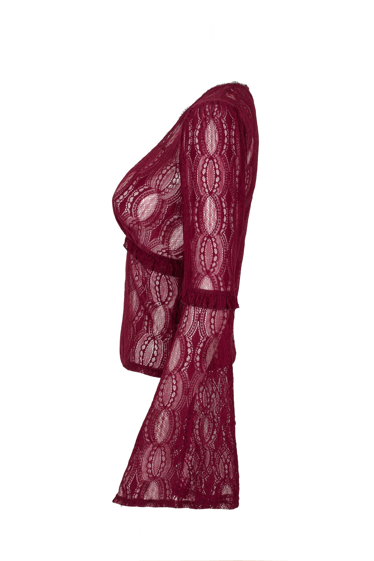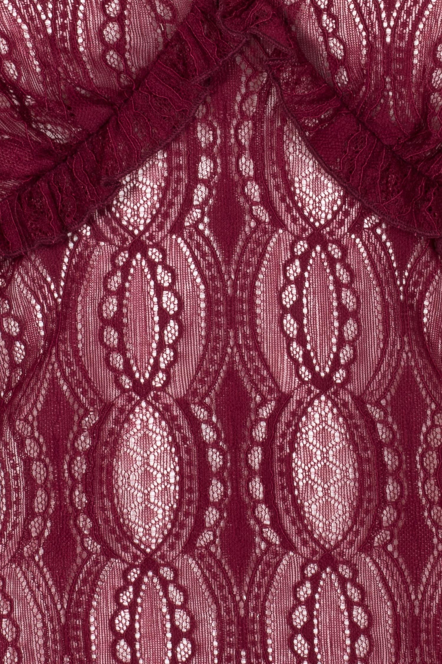 Romantic with a dark twist, this burgundy lace top is your new fave. With a delicate V-neckline trimmed in matching lace, underbust frill detail, and flared sleeves from the elbow down, it brings all the drama without even trying.