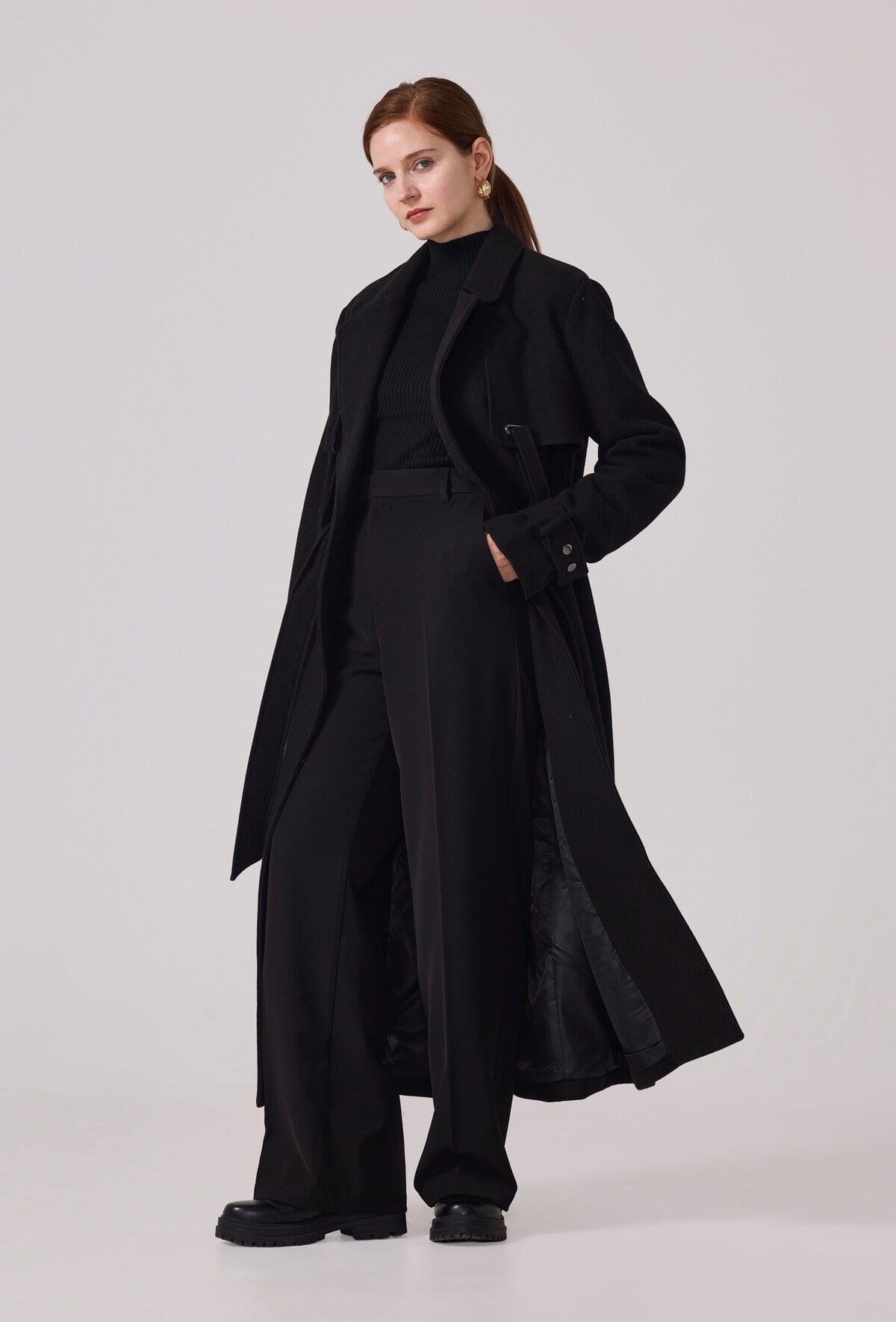 With its tailored silhouette, trench-style belt, and storm flap detail, this black coat gives you all the classic mystery vibes with a modern, edgy twist. It’s warm, timeless, and ready to live in your closet forever.